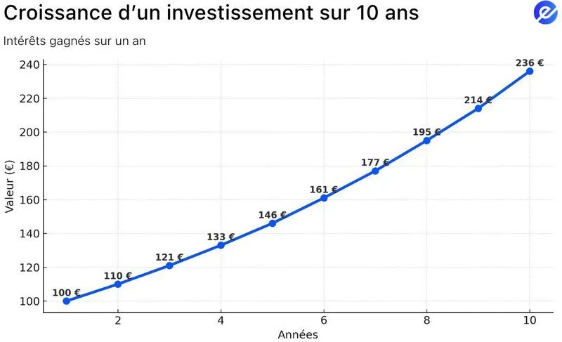 Prenons un capital initial de 100 € avec un taux d’intérêt annuel de 10 %.