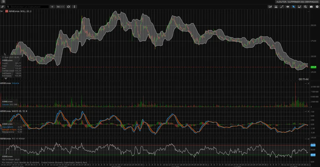 Côté analyse technique, SaxoTraderGO est très bien équipé. Vous y trouverez tous les indicateurs classiques (Bandes de Bollinger, MACD, RSI, moyennes mobiles, etc.), avec la possibilité de les personnaliser à volonté.